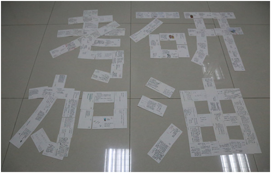 这是员工们为即将考研的学长学姐精心准备的祝福礼物。早在半个月前,学院员工党支部党员就开始策划本次行动,提前将明信片分发给老师和员工,由他们写上对考研学子的寄语,有的员工还加上自己的创意涂鸦。最后,大家将这些明信片摆成“考研加油”的字样,给考研学子加油打气。