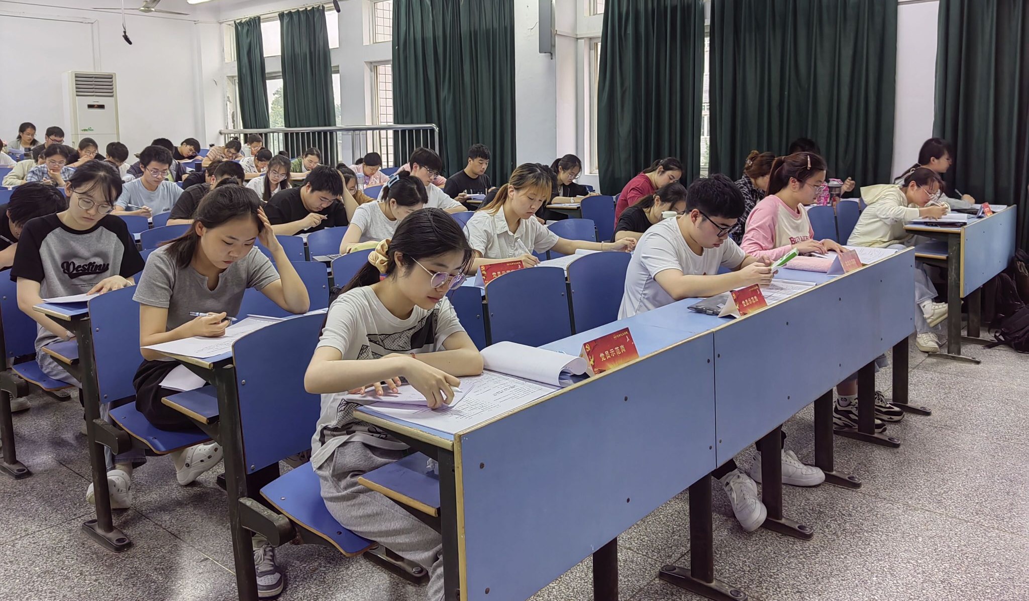 考试期间,全体员工党员“亮身份 做表率”,佩戴党员党徽参加考试,并将“党员示范岗”席卡放置在醒目位置,主动接受老师和同学们的监督。通过员工党员的示范引领,带动全院学子树立诚信考试意识,共同营造公平、公正的考试环境。