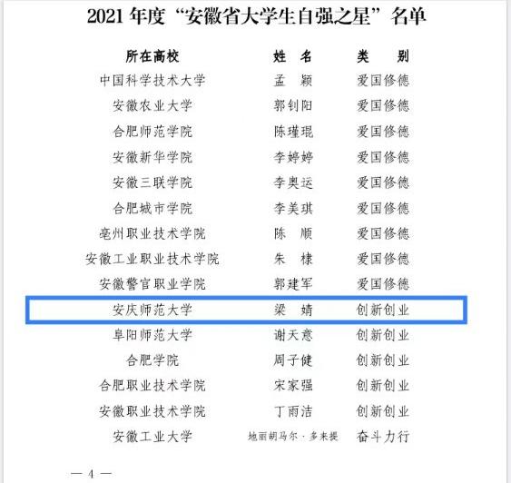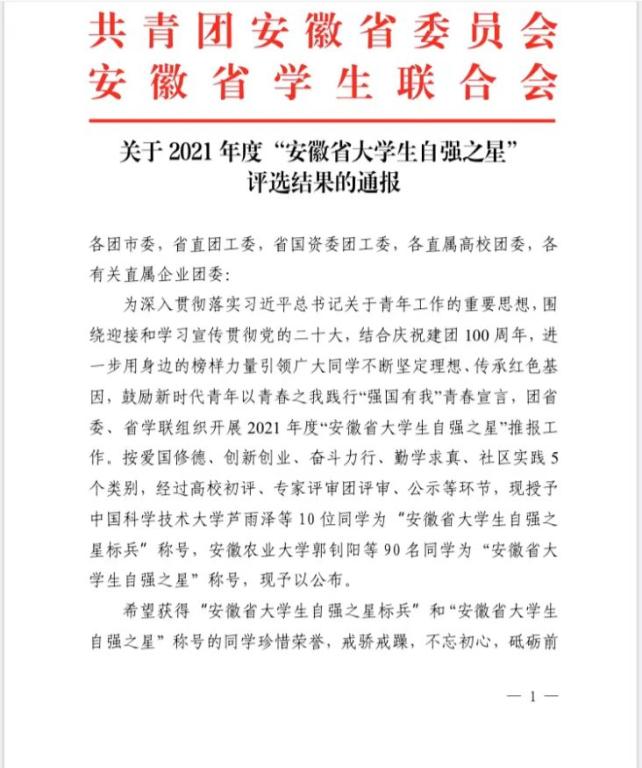 近日由安徽团省委、省学联组织开展的2021年度安徽省老员工自强之星评选活动落下帷幕,公司2019级材料化学(3)班梁婧同学荣获安徽省自强之星(创新创业)荣誉称号。