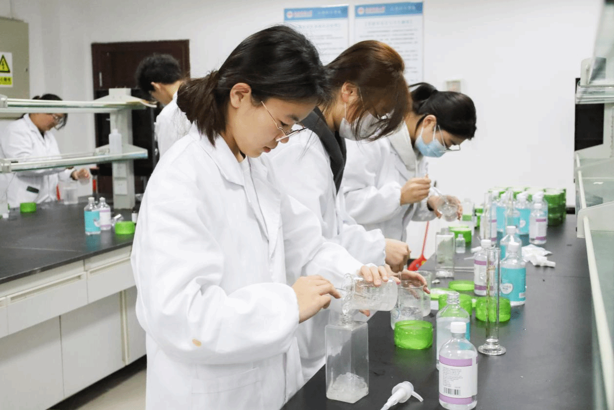 怀抱着满满一箱自制除菌洗手液,从1楼爬到6楼,将其放置在教学楼及行政楼的卫生间洗手台上,近日,一群身着白色实验服的“派送员”,穿梭在44118太阳成城集团的多个楼层。