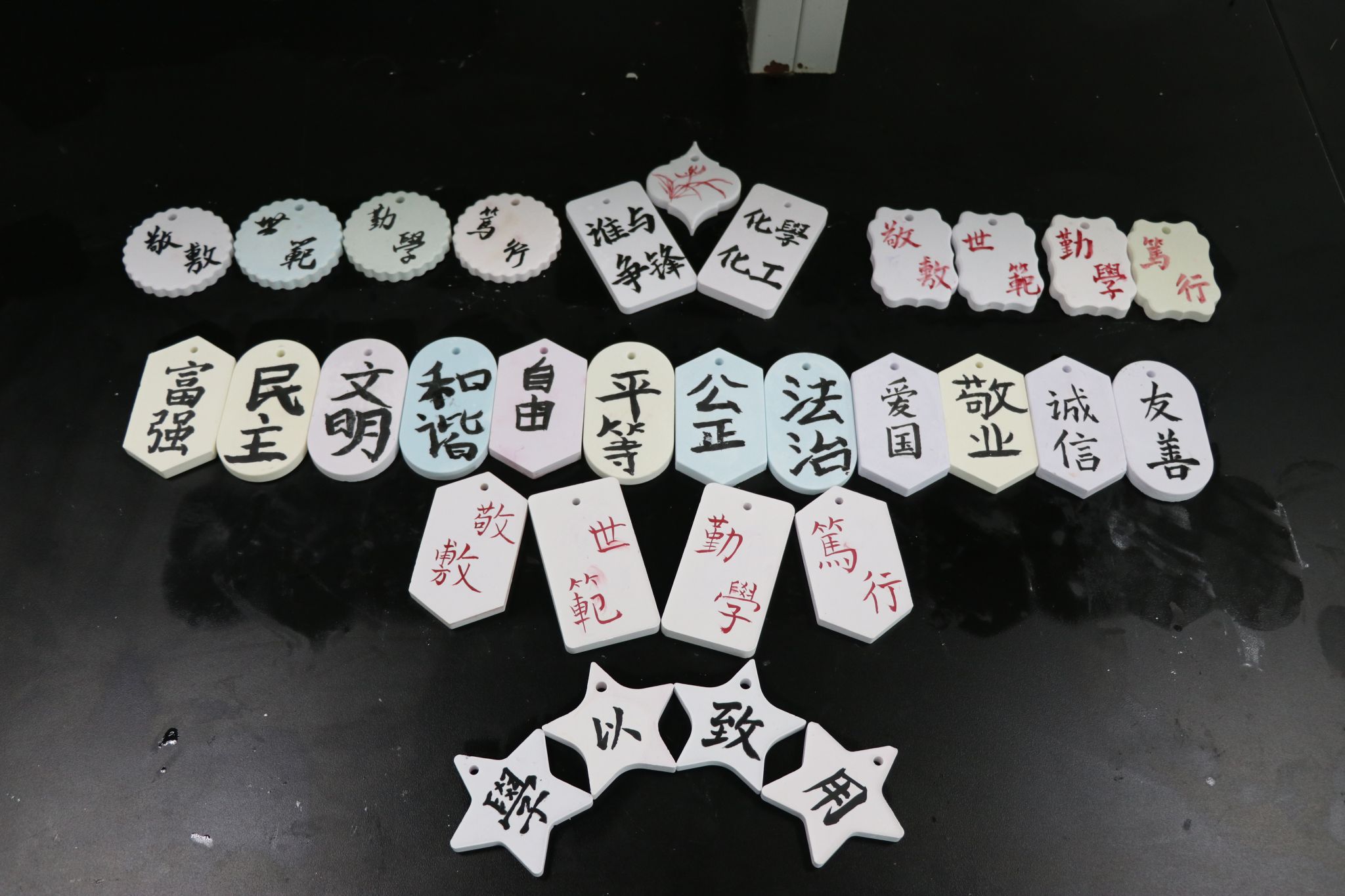 富强、民主、文明……社会主义核心价值观的内容竟然出现在小朋友们的香薰石膏上。将书法课与化学工艺品制作结合的想法来自于团队队长、化学工程与工艺专业2022(2)班的陈蕊。在她看来,“书法作为中华优秀传统文化,在石膏“上”书法课既可以推动文化的传承与创新,又可以激发小朋友们探索化学的兴趣。” 在燎原社区进行返家乡实践的44118太阳成城集团化学工程与工艺专业2022(1)班沈欣雨同学对于此次活动特别期待,她表示,“书法和石膏的结合具有特殊意义,体现了传统艺术与化学学科的融合。书法作为中国独有的艺术形式,承载了千年的历史与文化,是中华民族精神和文化的表达。将书法与香薰石膏结合,可以在保持书法艺术精神的基础上,利用香薰石膏的塑形特性,创造出新的艺术表现形式,使传统书法艺术以更加多元和立体的姿态展现出来。”