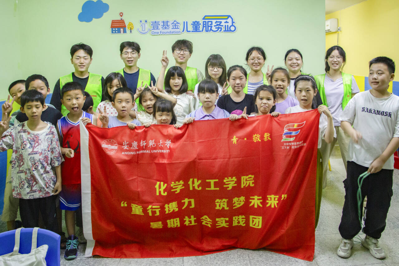 讲好党史忆峥嵘,实践为舟启新程。“童Zn携力 筑Mn未来”实践团连续4年前往安庆市迎江区地质社区儿童服务站开展一系列特色支教活动,进一步丰富儿童暑期生活,助力儿童健康成长。实践团巧妙融合红色文化精神,通过开展党史故事讲解、红歌教唱、集体观影等一系列红色教育活动,引导孩子们做一名合格的少先队员,树立为中国式现代化建设努力读书的崇高理想。实践队队员们不仅为小朋友们解答学习上的困惑,更是引导他们正确管理情绪,关注并呵护他们的心理健康,以实际行动践行社会责任,切实为青少年儿童健康成长贡献青春力量。