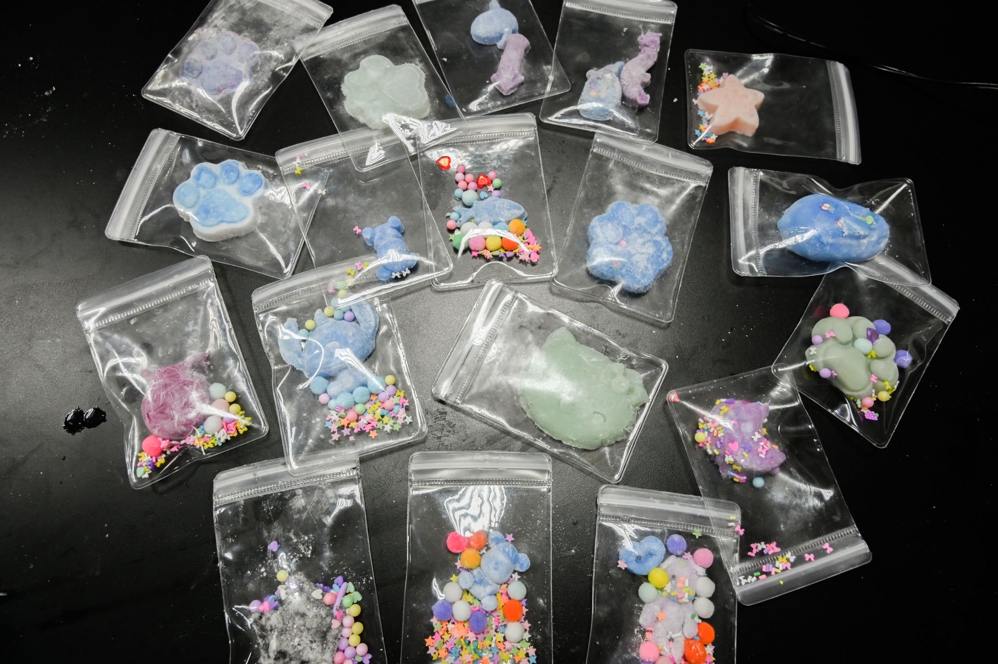 员工们两人为一组,身着白色实验服,手戴一次性乳胶手套。他们在电子天平上根据模具的大小称取A、B胶各15~20克,滴入自己喜欢的颜料后,使用搅拌棒将其进行搅拌融合,最后将混合物倒入已事先在其内部均匀涂抹了凡士林的模具中。