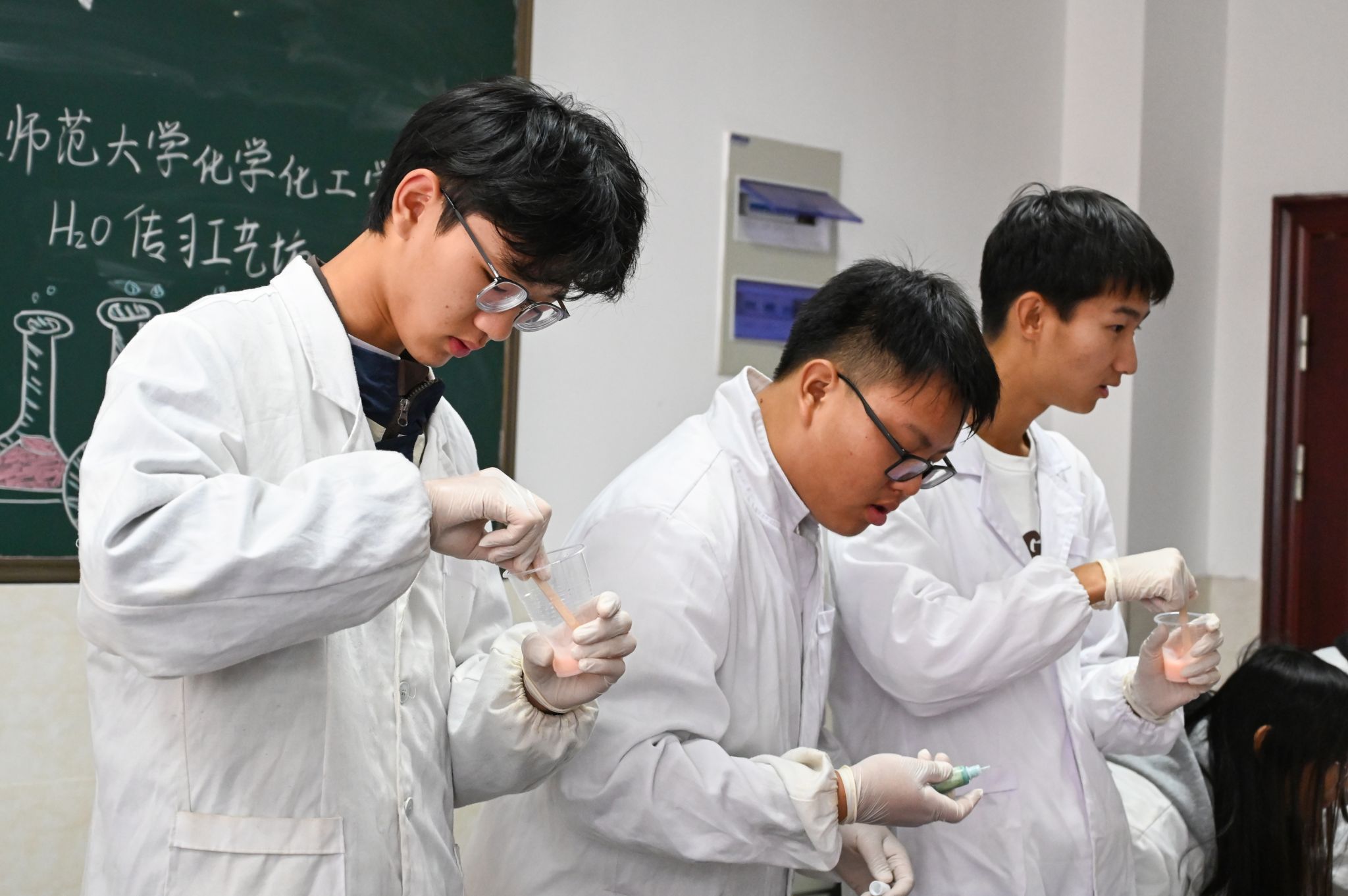 称取AB胶、加入色素、充分搅拌……实验步骤被条理清晰地罗列在黑板上。“A胶与B胶的克重必须保持一致。”活动正式开始前,化学工程与工艺专业2023(2)班的廖芸颉作为讲解员,向参加此次活动的员工们详细介绍了制作捏捏乐所需的材料及注意事项。小老师们在实验室的各个角落穿梭,随时为需要帮助的员工提供指导。“看到他们从起初的迷茫无措到掌握技巧后的自信从容,我觉得自己的付出是有意义的。”廖芸颉坦言。