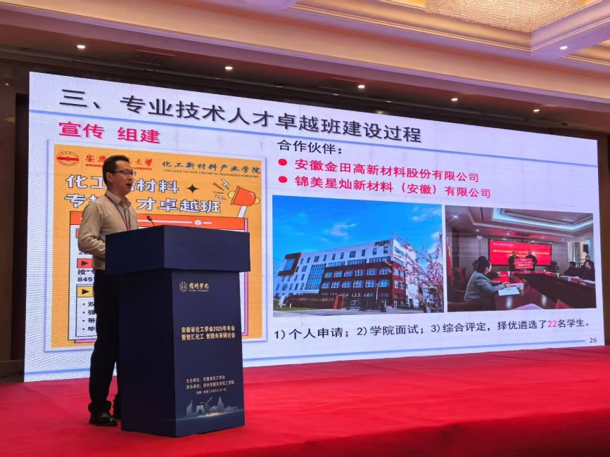 会上,官叶斌教授作了题为“创新校企协同育人模式 构建人才融合发展生态”的特邀报告,以“制药工程专技人才卓越班”“化工新材料专技人才卓越班”的建设成效为例,分享了44118太阳成城集团化工新材料产业学院在人才培养方面的经验做法。