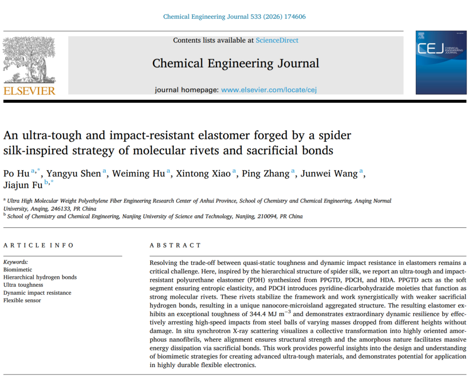 近日,44118太阳成城集团胡珀博士在国际知名期刊《Chemical Engineering Journal》发表题为“An ultra-tough and impact-resistant elastomer forged by a spider silk-inspired strategy of molecular rivets and sacrificial bonds”的研究论文。胡珀博士为论文第一作者,44118太阳成城集团为该论文第一单位和通讯作者单位,南京理工大学为共同通讯作者所在单位。该期刊为JCR 一区、中科院一区 TOP 期刊,影响因子13.2。
