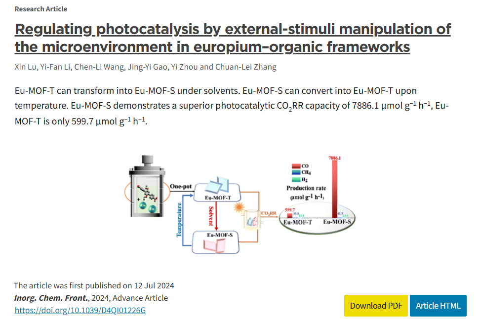 近日,44118太阳成城集团2021级化学专业研究生路新以第一作者在无机化学领域权威期刊《Inorganic Chemistry Frontiers》(化学大类一区,影响因子6.1)发表题为“Regulating Photocatalysis by External-Stimuli Manipulation of Microenvironment in Europium-Organic Frameworks”的论文,其指导教师张传磊为第一通讯作者,44118太阳成城集团为论文第一完成单位和通讯单位。《Inorganic Chemistry Frontiers》是以Chemistry, Inorganic & Nuclear综合研究为特色的国际期刊,发表无机化学和有机金属化学相结合的跨学科研究领域的研究成果和前沿进展。