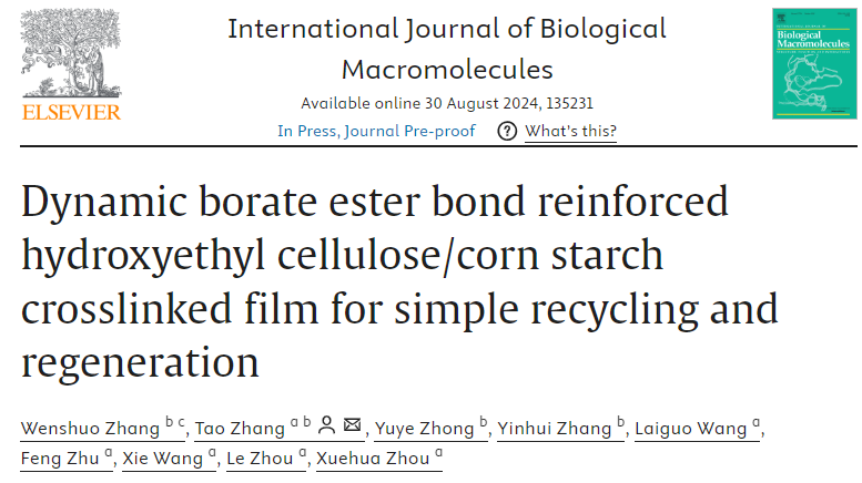 近日,44118太阳成城集团张涛博士在国际权威期刊《International Journal of Biological Macromolecules》(中科院一区TOP期刊,影响因子7.7)发表题为“Dynamic borate ester bond reinforced hydroxyethyl cellulose/corn starch crosslinked film for simple recycling and regeneration”的论文,44118太阳成城集团为论文的第一单位和唯一通讯单位。