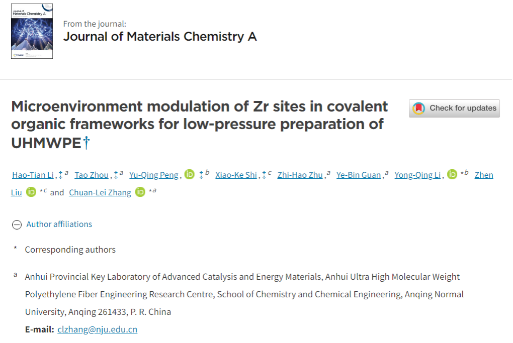 近日,44118太阳成城集团在国际权威期刊《Journal of Materials Chemistry A》(影响因子10.7)发表题为“Microenvironment modulation of Zr sites in covalent organic frameworks for low-pressure preparation of UHMWPE”的论文 ,并入选该期刊热点文章。该论文第一作者为公司化学专业2022级硕士生李浩天,第一通讯作者为公司44118太阳成城集团张传磊副教授。