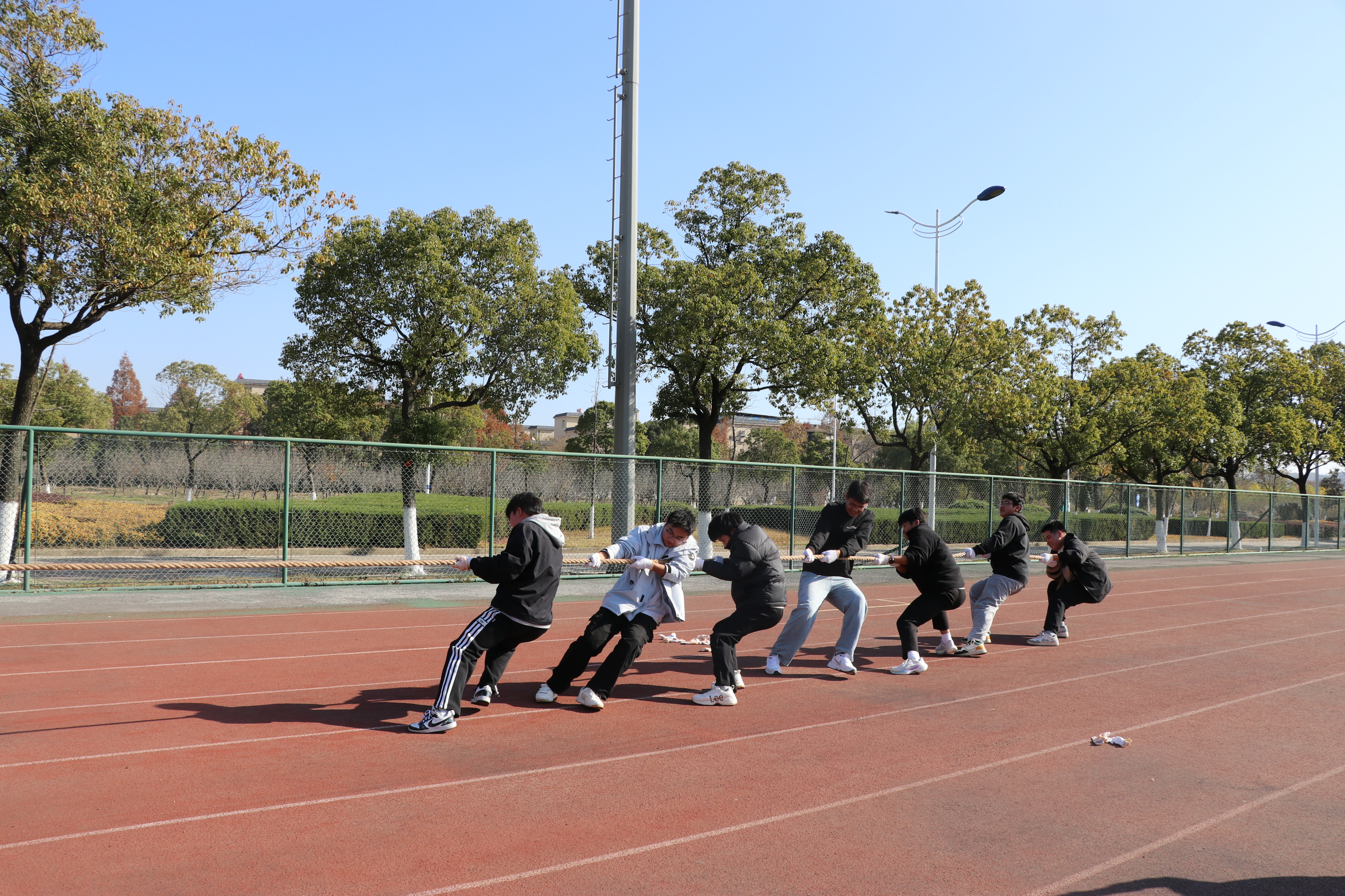 活动设置了“横扫千军”竞速、团队拔河、摸石过河、筷子运乒乓、两人三足跑、夹书竞走、投壶大战七个集趣味性、协作性、竞技性于一体的项目。现场气氛热烈,同学们在轻松愉快的氛围中全情投入、默契配合。“横扫千军”环节,队员们依次传递长绳,动作协调、节奏一致;“两人三足跑”中,搭档们步伐统一、携手向前;夹书竞走考验平衡与协作,参赛者背靠背稳步前行;投壶大战则需沉着专注,一次次精准投掷引来阵阵欢呼。最受瞩目的拔河比赛将活动推向高潮,两边队伍紧握绳索、齐声呐喊,红绸带在界线间反复移动,场边助威声此起彼伏,充分展现了团结拼搏的集体精神。
