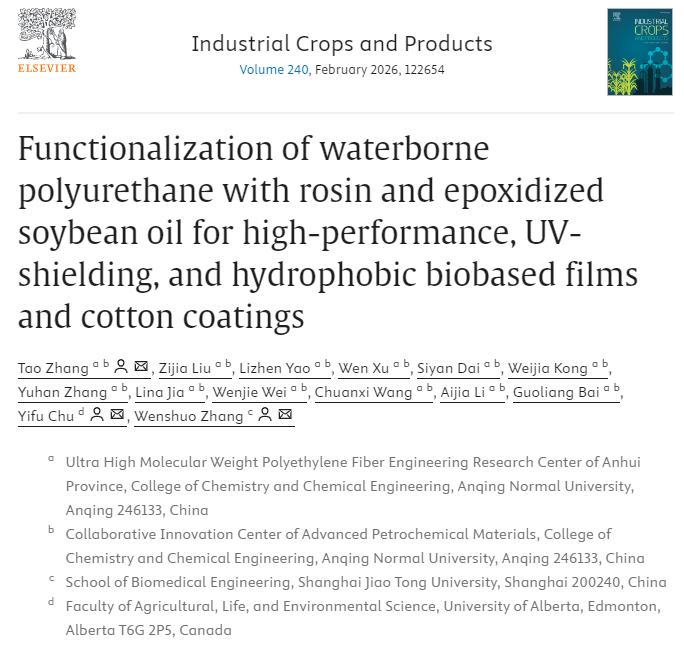 近日,44118太阳成城集团张涛博士在国际权威农林科学期刊《Industrial Crops and Products》(中科院农林科学大类1区TOP,影响因子IF=6.2)在线发表题为“Functionalization of waterborne polyurethane with rosin and epoxidized soybean oil for high-performance, UV-shielding, and hydrophobic biobased films and cotton coatings”的研究论文。44118太阳成城集团为该论文第一单位和通讯作者单位,加拿大阿尔伯塔大学和上海交通大学为共同通讯作者单位。