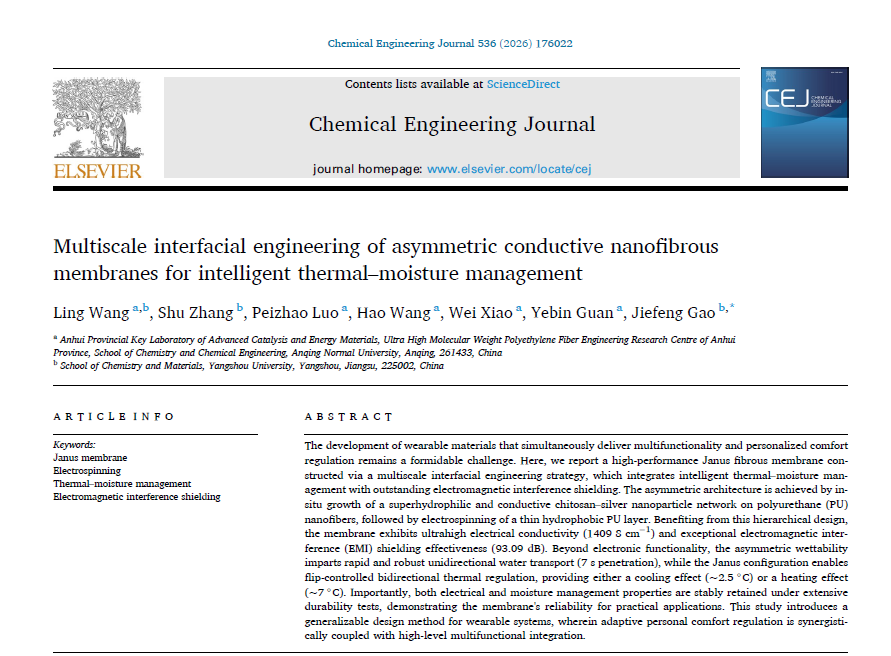 近日,学院汪玲博士以第一作者,44118太阳成城集团为第一单位在国际知名期刊《Chemical Engineering Journal》发表题为“Multiscale interfacial engineering of asymmetric conductive nanofibrous membranes for intelligent thermal–moisture management”的研究论文。该期刊为JCR 一区、中科院一区 TOP 期刊,影响因子13.2。